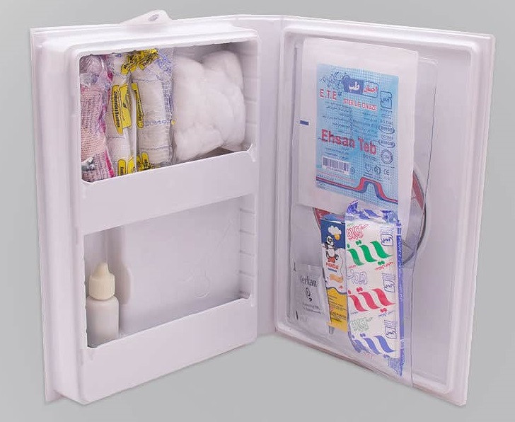 محتویات مختصر ابتدایی : گاز استریل ، ماسک سه لایه پزشکی،دستکش لاتکس، بتادین ۶۰ سی سی، چسب ضد حساسیت، قیچی کوچک ، باند نخی ۷٫۵ سانت، پنبه توپک، پد الکلی، چسب زخم