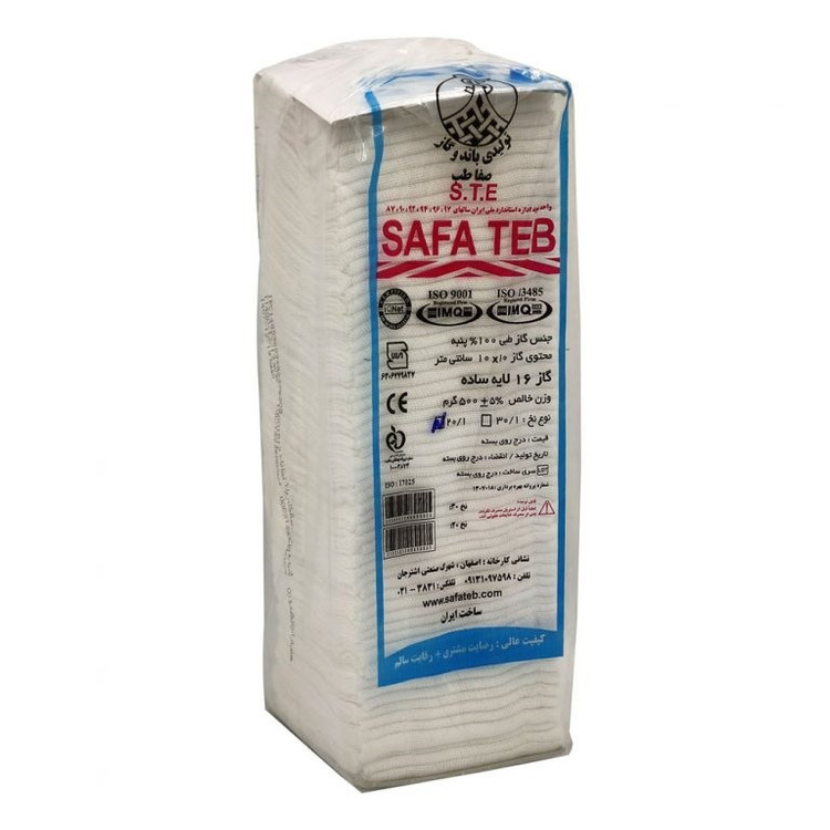 گاز کیلویی «صفا طب» از پارچه تار و پودی و ۱۰۰% پنبه تهیه شده است و در ابعاد ۱۰*۱۰ سانتی متر می باشد. گاز طبی صفا طب ، بدون بو و عاری از هرگونه آلودگی فیزیکی و پرز و از نوع ساده و بدون خط می باشد. این محصول به دلیل قابلیت بالای جذب خون و محلول های ضدعفونی کننده در اتاق عمل کاربرد بسیار دارد و گاز غیر استریل صفا طب مناسب برای شستشو دادن، ضدعفونی کردن و پانسمان جراحت و جذب خون در عمل های جراحی می باشد و دارای 16لا و وزن 500 گرم می باشد.