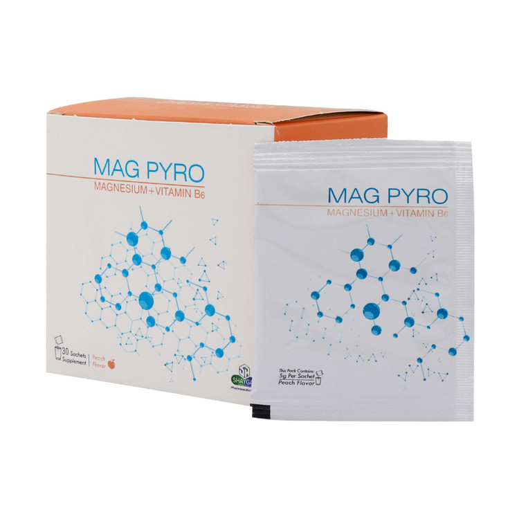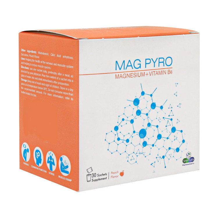 ساشه مگ پیرو دارو افشان شایگان حاوی منیزیم و ویتامین ب۶ بوده و به سلامت سیستم عصبی، عضلانی و کاهش اسپاسم عضلانی کمک میکند. این مکمل در درمان سردردهای میگرنی و درد شکمی در دوران پیش از قاعدگی نیز موثر است. گرفتگی عضلانی از جمله دردهایی است که هنگام شب و یا حتی در خواب باعث آزار و بیدار شدن فرد میشود که این گرفتگیها اغلب در ناحیه ران و ساق پا رخ میدهد. برای رهایی از این مشکلات بهتر است از قرص منیزیم استفاده کنید.
