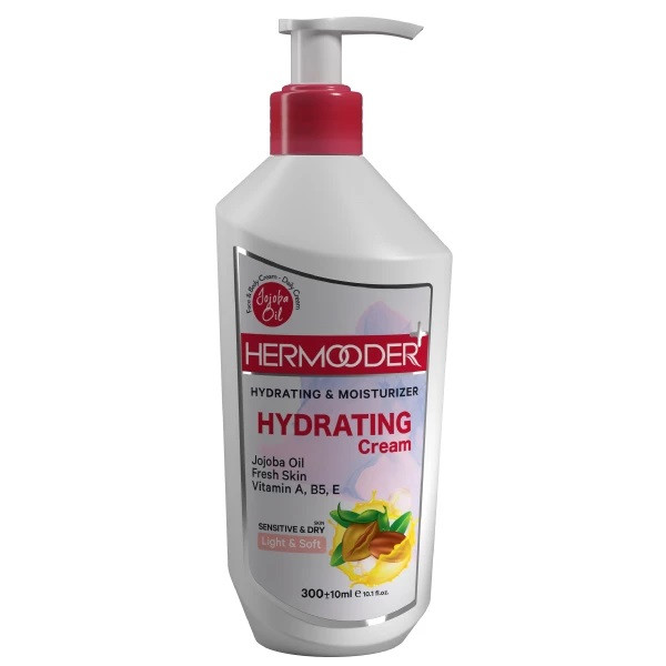 کرم آبرسان جوجوبا هرمودر برای پوست های خشک و حساس با حجم 300 میل حاوی موارد روان کننده هستند که وظیفه تامین آب برای پوست را به عهده دارند و با آبی که برای لایه اپیدرم پوست تامین می کنند، از خشکی پوست که سر منشاء آن کاهش هیدراتورها می باشد، جلوگیری می نمایند. کرم های آب رسان از مقدار خیلی کمی چربی برخوردار می باشند. به همین دلیل بافت سبکی داشته و زود جذب پوست می شوند. این کرم آبرسان در مدل پمپی بوده که استفاده از آن بسیار آسان بوده و شامل ویتامین های A, E و B5 و روغن جوجوبا می باشد خواص روغن جوجوبا: آنتی باکتریال و ضد التهاب، حاوی انواع ویتامینها به ویژه ویتامین ایی برای مبارزه با خشکی پوست، شیوع بیماری آکنه و چین و چروک