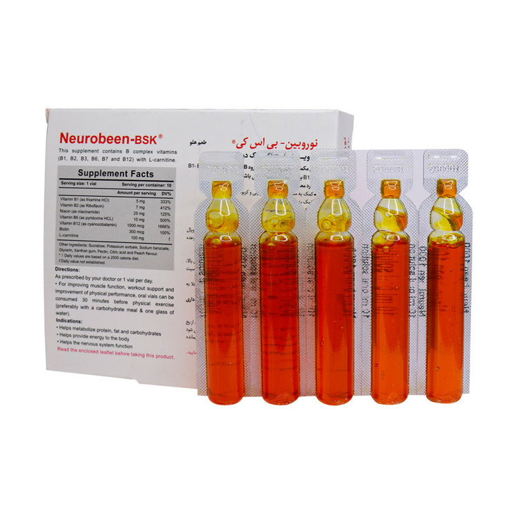 ویال نوروبیون حاوی ۱۰ عدد ویال خوراکی که تامین کننده ویتامینهای گروه B به همراه ال کارنیتین است و میتواند جایگزین خوبی برای آمپول نوروبیون باشد. ویتامینهای ذکر شده در ویال نوروبین بی اس کی باعث افزایش متابولیسم انرژی بدن میشود و تاثیر مستقیمی بر متابولیسم چربیها، کربوهیدراتها و پروتئینها دارد. ویال خوراکی نوروبین بنیان میتواند یک مکمل مناسب برای ورزشکاران نیز باشد و باعث افزایش قدرت عضلات و همچنین بهبود عملکرد ورزشی آنها شود.