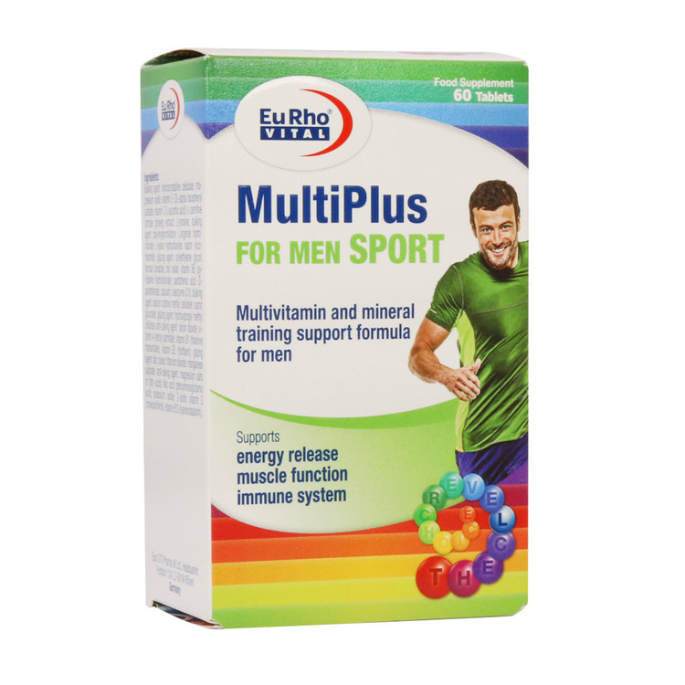 قرص مولتی پلاس فور من اسپرت یوروویتال یک فرمولاسیون خاص برای ورزشکاران خصوصا آقایان است. این فراورده تامین کننده میزان کافی و متعادل از مواد مغذی با مصرف روزانه یک عدد قرص است. ویتامینهای گروه B از جمله ب۱، ب۲، ب ۶ و سی، مواد معدنی مانند منیزیم، منگنز و آهن به کار رفته در این مکمل ورزشی آقایان در متابولیسم طبیعی انرژی نقش دارند. به علاوه ویتامینهای A، D و D در کاهش ضعف و خستگی موثر هستند.