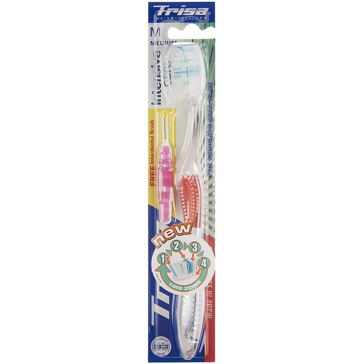 پکیج مسواک و مسواک بیندندانی برند «تریزا» (trisa) مدل «Hntensive Care» در سه رنگ آبی، مشکی و نارنجی ارائه شده است. سایز این مسواک متوسط بوده و برای بزرگسالان مناسب است. مسواک تریزا محصول کشور سوئیس و بسیار باکیفیت است. سری مسواک تریزا ابعاد 1.5 × 3 سانتیمتری دارد و دارای درپوش محافظی است که از آلودهشدن مسواک در محیط جلوگیری میکند.