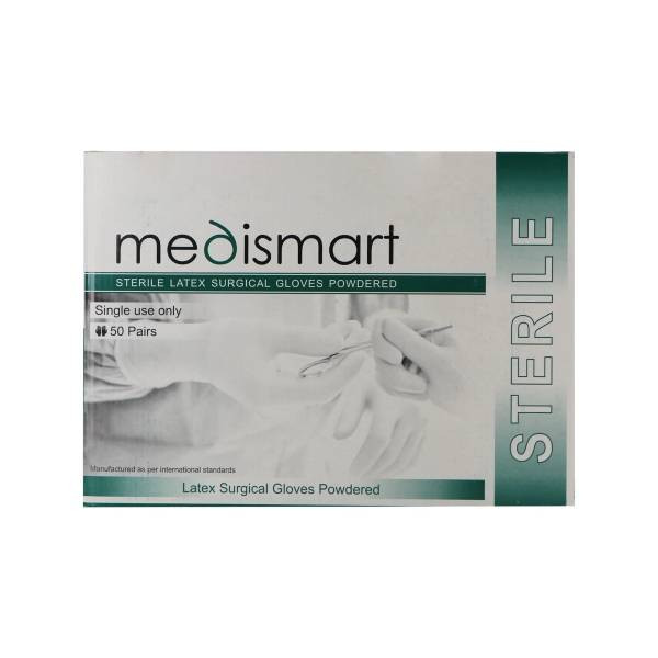 دستکش جراحی مدی اسمارت یکی از بهترین دستکش های موجود می باشد این دستکش به راحتی دست را پوشش داده و مقاومت خوبی در برابر ضربات احتمالی دارد . این محصول حاوی یک جفت دستکش لاتکس از نوع کم پودر سایز مدیوم بوده که توسط گاز اتیلن اکساید، استریل گردیده و در یک بسته کاغذی بصورت وکیوم شده قرار دارد. این دستکش از لاتکس طبیعی ساخته شده و با ایجاد خاصیت کشسانی، باعث میشود دستکش هنگام دست کردن به راحتی و بدون پاره شدن پوشیده شود.