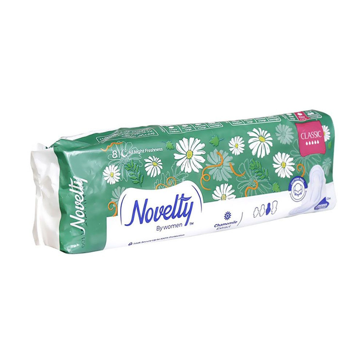 نوار بهداشتی کتانی بسیار ضخیم ناولتی ویژه شب با جذب 5 قطره و با تکنولوژی یونهای طبیعی متناسب با ارگونومی بدن شما طراحی شده است و دارای محافظ جانبی بوده که به عنوان بال شناخته می شود. نوار چسب پد ناولتی به راحتی به اطراف لباس شما پیچیده شده و از پس دادن و رطوبت طرفین جلوگیری میکند. این نوار بهداشتی از مواد پنبه مانند با سطح ضد آب ساخته شده است که از رسیدن خونریزی قاعدگی به روی لباس شما جلوگیری میکند. در اواسط دوران قاعدگی که میزان خون بیشتر است، استفاده از پدهای بهداشتی بالدار با سایز خیلی بزرگ توصیه میشود. این محصول قدرت جذب بسیار بالایی دارد و در زمان راه رفتن اطمینان و آرامش خاطر بیشتری به شما میدهد.
