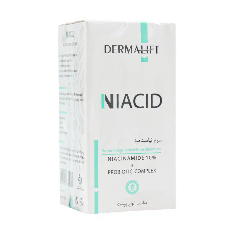 سرم نیاسید درمالیفت یک محصول قدرتمند برای کنترل چربی، کاهش منافذ باز و بهبود سلامت پوست است. این سرم حاوی نیاسینامید 10درصد و زینک پی سی ای 1 درصد بوده و با تنظیم ترشحات چربی، مانع از براق شدن پوستهای چرب میشود. علاوه بر این با تقویت سد دفاعی پوست از خشکی و حساسیت جلوگیری نموده و به حفظ رطوبت و شادابی پوست کمک مینماید. استفاده منظم از سرم نیاسین آمید درمالیفت پوستی مات، صاف و شفاف برای شما به ارمغان میآورد. در نظر داشته باشید جهت کنترل چربی پوست میتوانید علاوه بر این محصول، از شوینده پوست چرب استفاده نمایید تا با پاکسازی عمیق پوست، چربی اضافه را از بین ببرید.