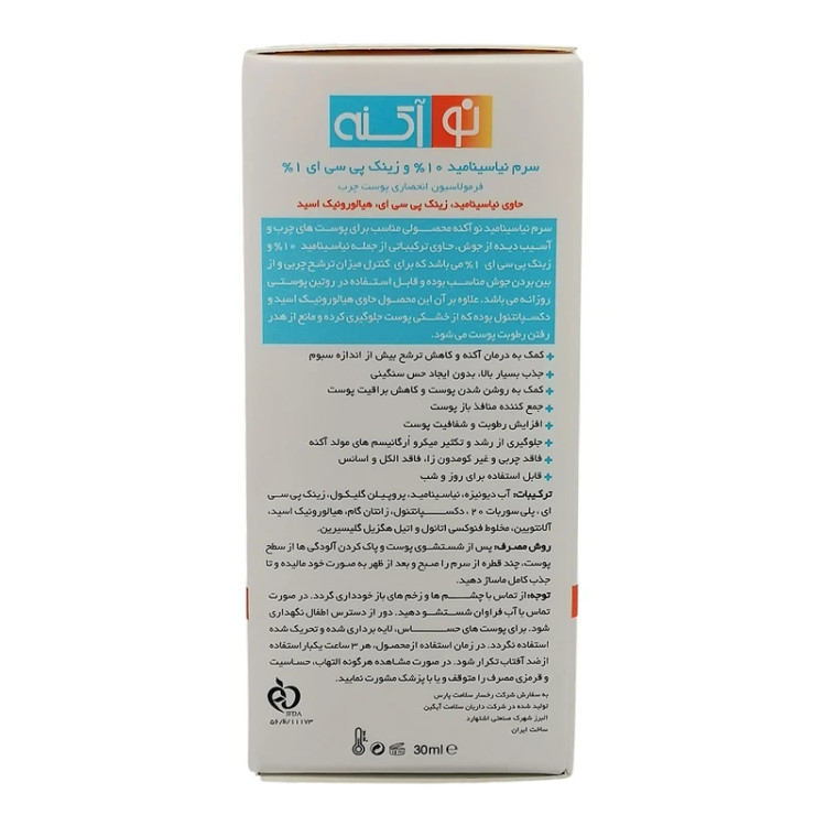 سرم نیاسینامید نوآکنه محصولی مناسب برای پوست های چرب و آسیب دیده از جوش حاوی ترکیباتی از جمله نیاسینامید 10% و زینک پی سی ای 1% می باشد که برای کنترل میزان ترشح چربی و از بین بردن جوش مناسب بوده و قابل استفاده در روتین پوستی روزانه می باشد. علاوه بر آن این محصول حاوی هیالورنیک اسید و دکسپانتول بوده که از خشکی پوست جلوگیری کرده و مانع از هدر رفتن رطوبت پوست می شود.
