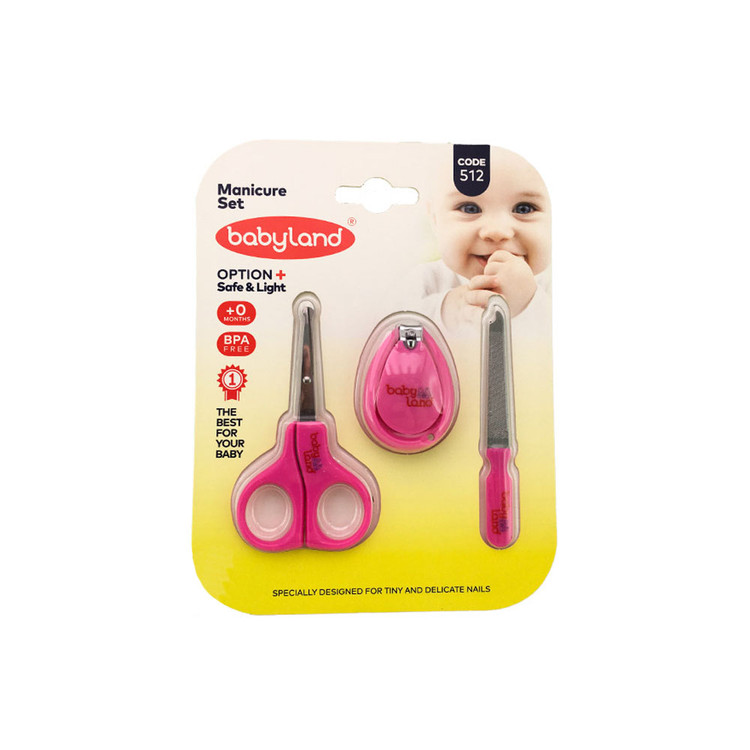 : ست مانیکور کودک بیبی لند با طراحی فانتزی و کیفیت درجه یک در دو رنگ آبی و صورتی می باشد. اقلام این ست ناخن گیر،قیچی و سوهان برای کودکان است. سر قیچی به صورت گرد طراحی شده تا گوشههای ناخن راحت تر گرفته شود و آسیبی به انگشت نوزاد نرساند.