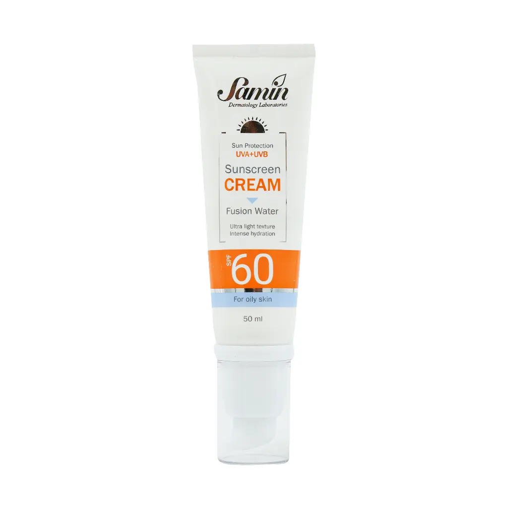 کرم ضد آفتاب بی رنگ فیوژن واتر پوست چرب SPF60 ثمین 50 میلی لیتر