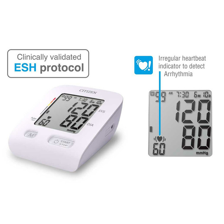 فشارسنج دیجیتال بازویی سیتیزن مدل 517 قابلیت نشان دادن ضربان نا متعارف قلب (آریتمی) را دارد. این فشارسنج طبق شاخص WHO اندازه گیری کرده و بالا و یا پایین بودن فشار را نمایش می دهد. این دستگاه دارای محفظه مخصوص کاف بوده و بخاطر همین ویژگی جای کمتری اشغال کرده و به راحتی می توان آن را حمل کرد.