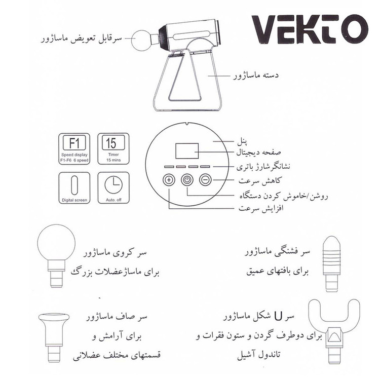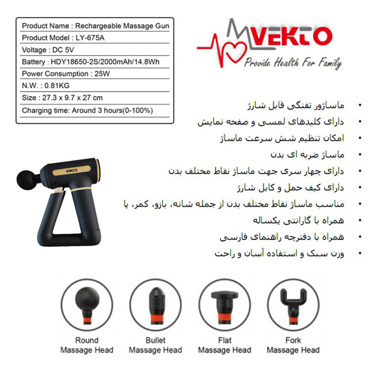 دستگاه ماساژور حرفهای برند وکتو Vekto مدل LY675A ، از پر معروفترین برند های تجهیزات پزشکی است. این دستگاه بهترین وسیله برای از بین بردن اسید لاکتیک به وجود آمده بعد از ورزش یا فعالیت سنگین و حتی فعالیتهای روزمره است. این ماساژور مناسب برای رفع خستگی و کوفتگی عضلات، افزایش جریان خون، ریکاوری عضلات و ریلکس کردن عضلات است. دستگاه ماساژور تفنگی علاوه بر اینکه برای ورزشکاران بسیار پرکاربرد است، برای فیزیوتراپها و کسانی که از دردهای عضلانی رنج میبرند، مناسب است. همچنین این دستگاه برای کسانی که نیاز به رفع خستگی و آرامش عضلات بدن دارند، بهترین گزینه است.این دستگاه یک ماساژور ارتعاشی بی سیم است که به شما کمک میکند تا عضلات دارای درد و گرفتگی را شل کنید و دامنه حرکتی خود را افزایش دهید. دستگاه دارای 4 نوع سری مختلف است که یک تجربه ماساژ آرامش بخش را به وجود میآورد و باعث کاهش درد و آسیبهای استخوانی میشود، به رفع درد و سفتی عضلات کمک میکند و دامنه حرکت و گردش خون را بهبود میبخشد و باعث تسریع در گرم شدن و بهبودی عضلات میشود، همچنین باعث کاهش درد عضلانی بعد از تمرینهای سخت و فشرده ورزشی برای ورزشکاران میشود. این ماساژور به همراه یک کابل USB برای شارژ و یک کیف همراه عرضه میشود. این دستگاه دارای نمایشگر دیجیتال برای نماش سرعت و شارژ باطری است. این دستگاه به صورت پرتابل و سبک وزن میباشد .این وسیله به یک باتری قابل شارژ لیتیوم یونی مجهز شده که قابلیت شارژ مجدد و تا 100% آن حدود 3 ساعت طول می کشد. ماساژور برقی وکتو Vekto مدل LY675A امکان تنظیم سرعت را تا 6 سرعت نیز فراهم کرده است.