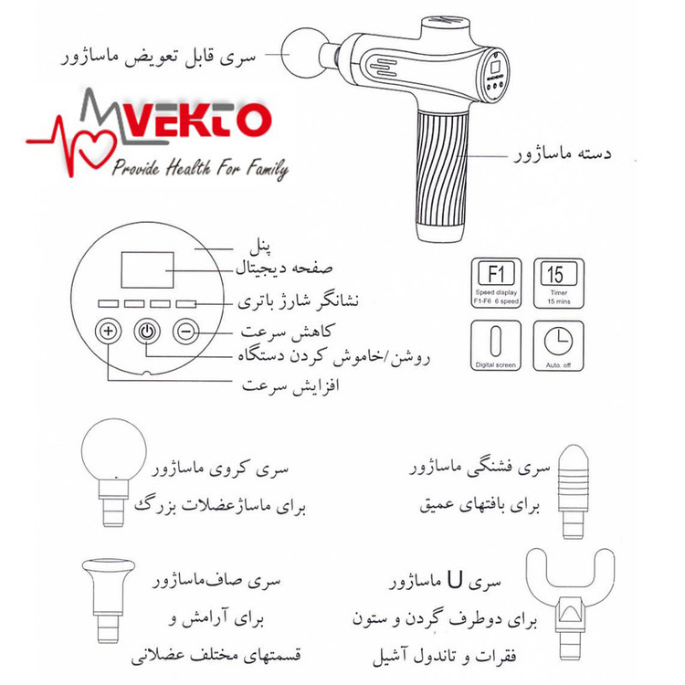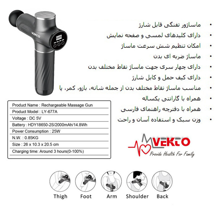 دستگاه ماساژور حرفهای برند وکتو Vekto مدل LY677A ، از پر معروفترین برند های تجهیزات پزشکی است. این دستگاه بهترین وسیله برای از بین بردن اسید لاکتیک به وجود آمده بعد از ورزش یا فعالیت سنگین و حتی فعالیتهای روزمره است. این ماساژور مناسب برای رفع خستگی و کوفتگی عضلات، افزایش جریان خون، ریکاوری عضلات و ریلکس کردن عضلات است. دستگاه ماساژور تفنگی علاوه بر اینکه برای ورزشکاران بسیار پرکاربرد است، برای فیزیوتراپها و کسانی که از دردهای عضلانی رنج میبرند، مناسب است. همچنین این دستگاه برای کسانی که نیاز به رفع خستگی و آرامش عضلات بدن دارند، بهترین گزینه است.این دستگاه یک ماساژور ارتعاشی بی سیم است که به شما کمک میکند تا عضلات دارای درد و گرفتگی را شل کنید و دامنه حرکتی خود را افزایش دهید. دستگاه دارای 4 نوع سری مختلف است. این ماساژور به همراه یک کابل USB برای شارژ و یک کیف همراه عرضه میشود. این دستگاه دارای نمایشگر دیجیتال برای نماش سرعت و شارژ باطری است. این دستگاه به صورت پرتابل و سبک وزن میباشد .این وسیله به یک باتری قابل شارژ لیتیوم یونی مجهز شده که قابلیت شارژ مجدد و تا 100% آن حدود 3 ساعت طول می کشد. ماساژور برقی وکتو Vekto مدل LY677A امکان تنظیم سرعت را تا 6 سرعت نیز فراهم کرده است.
