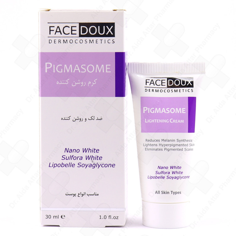 کرم روشن کننده صورت پیگمازوم فیس دوکس حاوی ماده ای به نام Nano White بوده که کمپلکس لیپوزومال موجود در آن ترکیب بسیار قوی ضد لک و تیرگی آربوتین حاصل از گیاه بیربری، ویتامین C و گلوتاتیون میباشد و با مهار آنزیم تیروزیناز باعث کاهش لک و تیرگی پوست میشود.