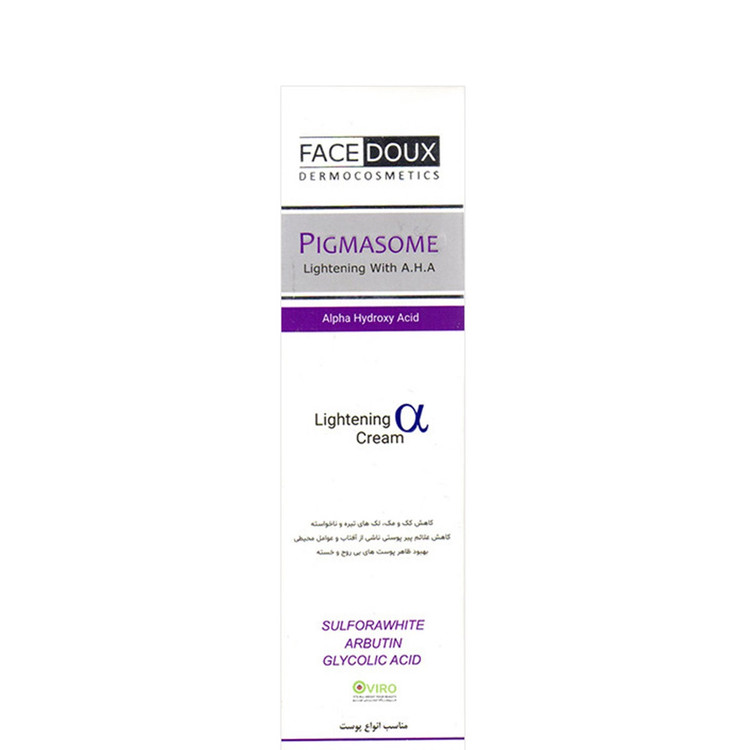 کرم ضد لک فیس دوکس لک هایی که در اثر پیری، بارداری و یا قرار گرفتن در معرض آفتاب به وجود می آید را از بین برده و باعث روشن شدن رنگ پوست می شود. کرم (pigmasome) پیگمازوم فیس دوکس به دلیل داشتن آ اچ آ سلول های مرده پوست را از بین برده و آن را شفاف و درخشان می کند. این محصول مناسب برای انواع پوست بوده و بدون ایجاد حساسیت و التهاب لک و تیرگی ها را از بین برده و علائم پیری در ظاهر پوست را کاهش داده